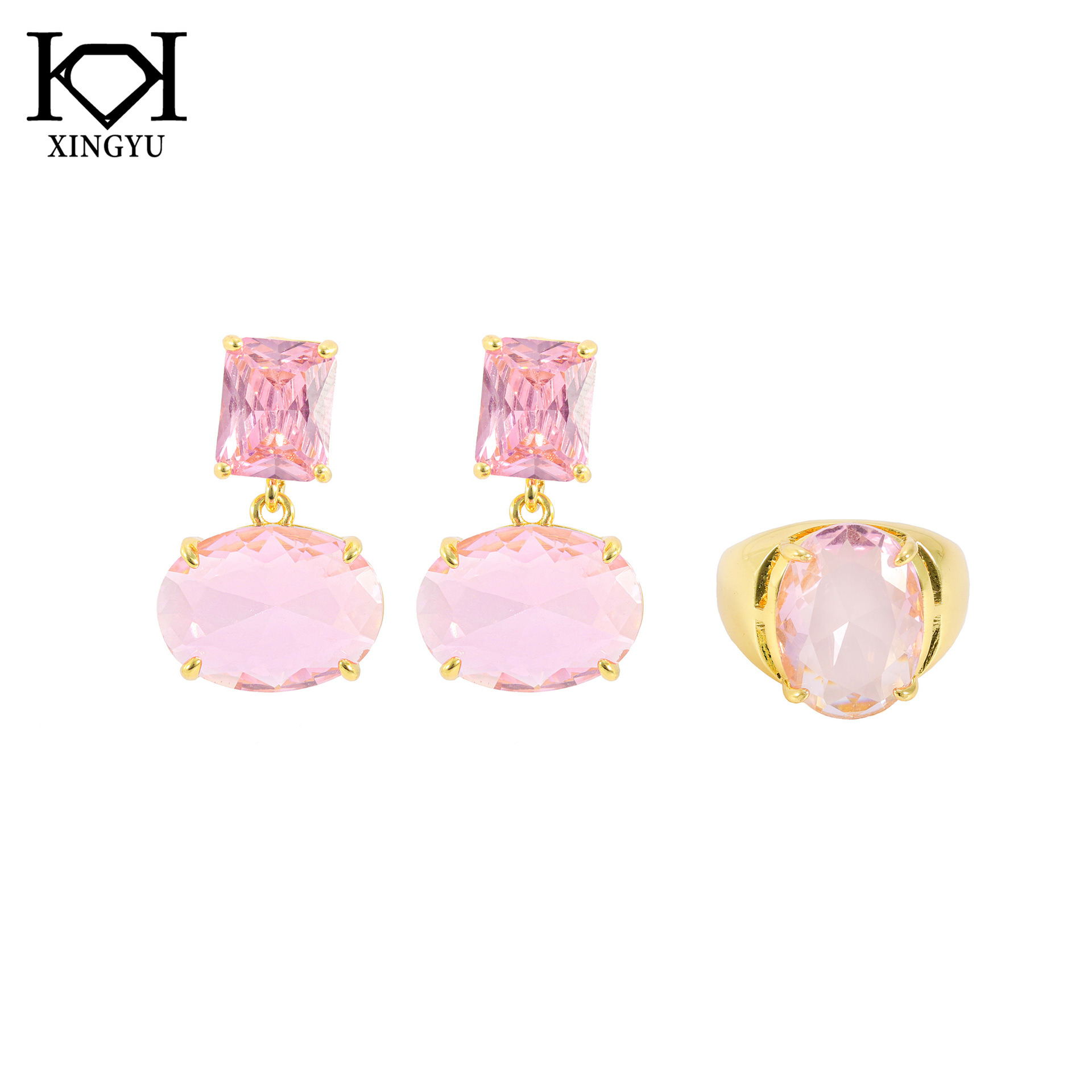Cross-border Fresh Light Luxury Style Clear Sense Pink Crystal Geometric Elegant Copper Plated Gold Earrings Ring suit