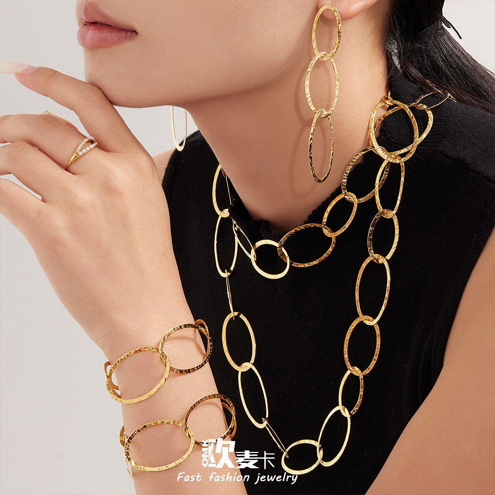 Omaca Stainless Steel Large Circle Hammer Pattern Hand-Spliced Necklace Bracelet Earrings Set Plated with 18K Real Gold Jewelry