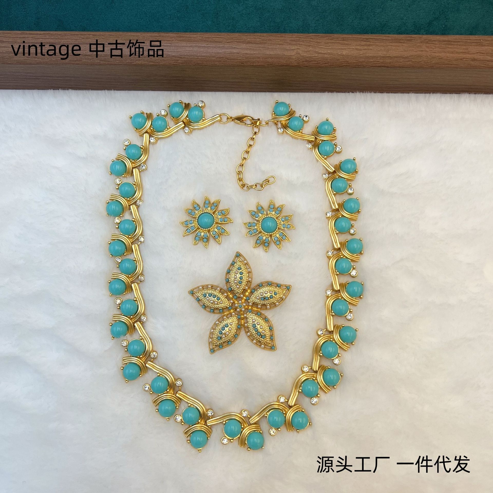Middle Ancient Jewelry suit Diamond-encrusted Gemstone Foreign Trade Cross-border Clavicle Chain Retro Copper Plated Gold vintage Earrings Batch