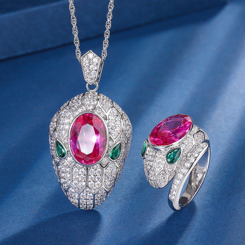 Zhuang Shengsheng Jewelry New Copper Gold-plated Rose Red Corundum Light Luxury Snakehead Set Pendant Ring 10*14