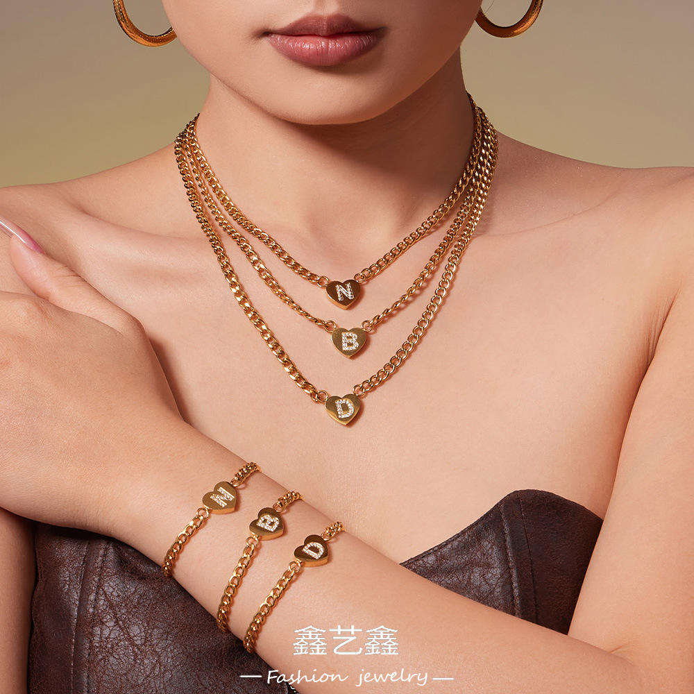 Stainless Steel Heart Letter Inlaid Zircon Pendant Necklace Bracelet Set European and American Personalized Jewelry Plated with 18K Real Gold