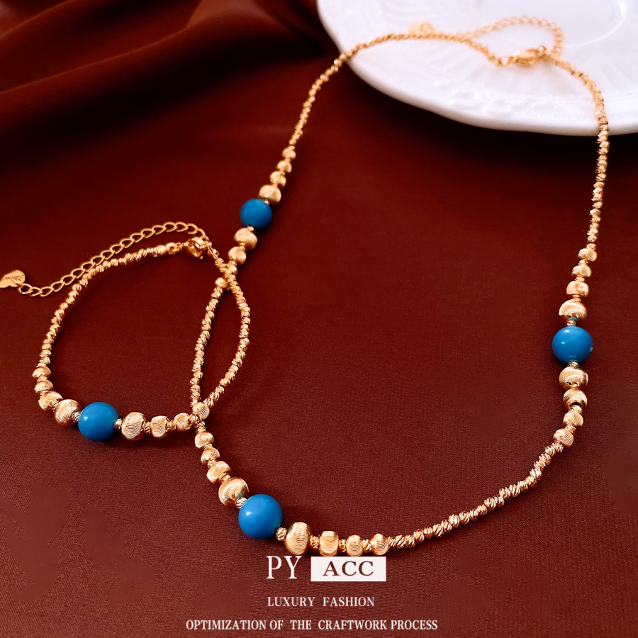 18K Real Gold Electroplated Stone Beaded Bracelet Necklace New Chinese Style Retro Sweater Chain Fashionable Versatile Jewelry Set