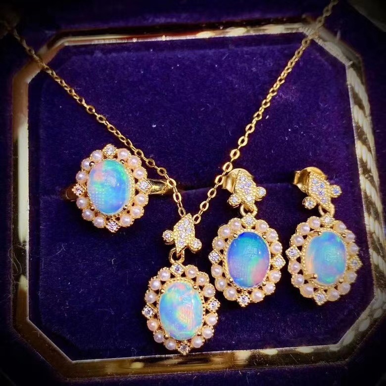 Live Hot Sale New Style Imitation Natural Opal Ring Luxury Elegant Color Pendant Jewelry suit Earrings Necklace