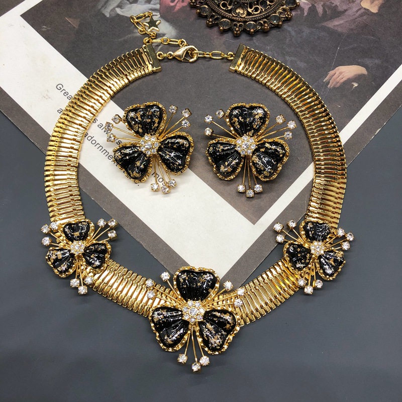 Antique Jewelry Classic Black Gold Platinum Flower Diamond Design Copper Plated Real Gold Necklace Earrings suit Niche Women