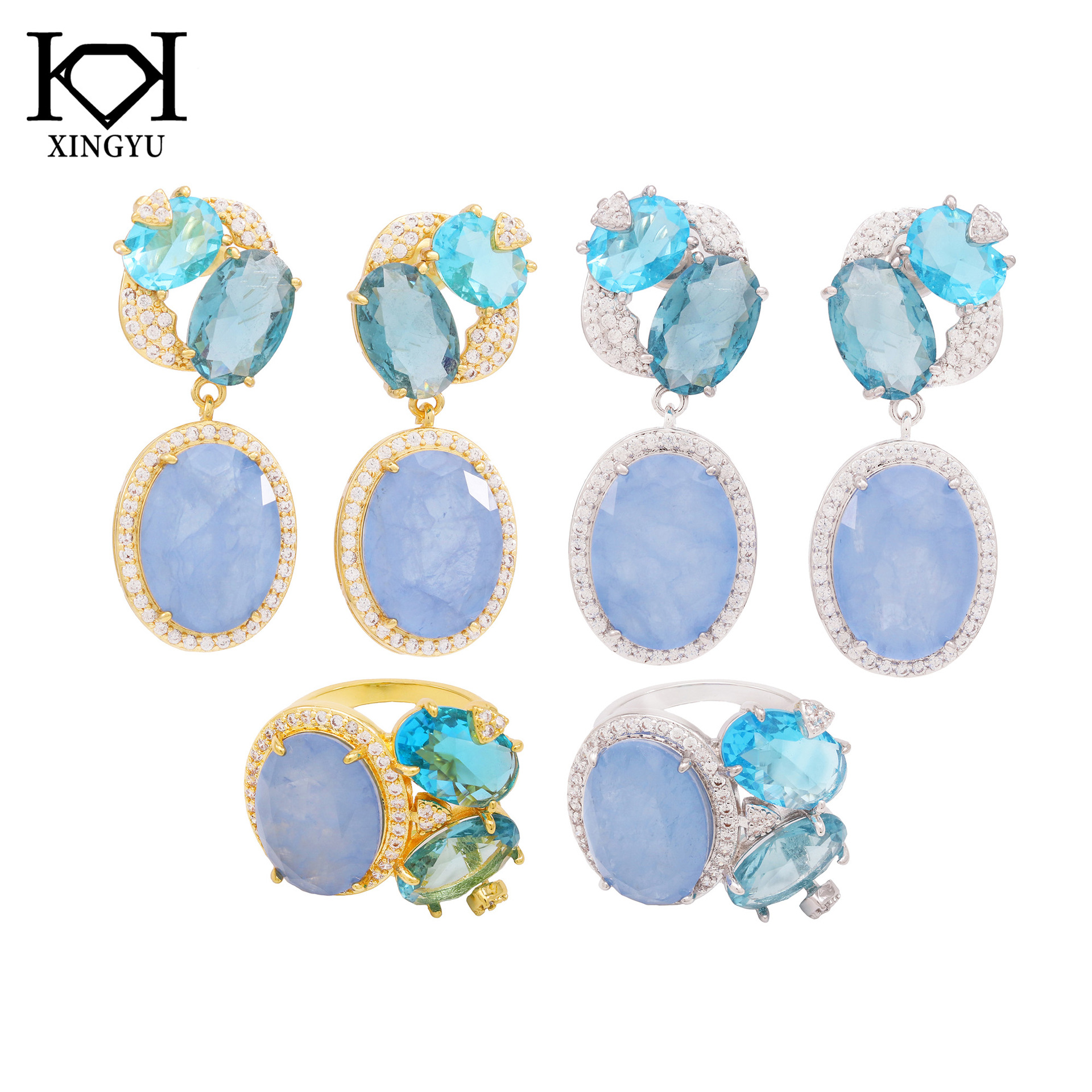 Internet Celebrity Live Broadcast Round Simulation Paraiba Set Pendant Necklace Ring Earrings Wedding Jewelry Three-piece Set