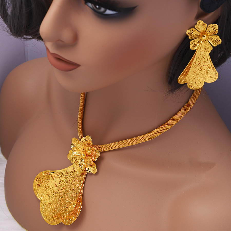 Middle East Cross Border Set for Women 24K Yellow Gold Color Big Flower Pendant NecKlace and Earrings Dubai Wedding Party Jewelry