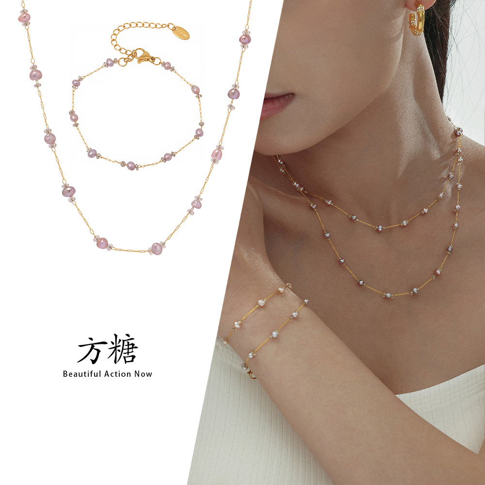 Sugar Cube New Queen Mother Freshwater Pearl Necklace Clavicle Chain Bracelet Set Women's Stainless Steel Real Gold Plated Jewelry