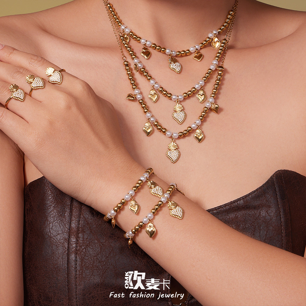 Omaca 5A Zircon Heart Crown Pendant Necklace Earrings Bracelet Ring Set Stainless Steel Plated 18K Real Gold