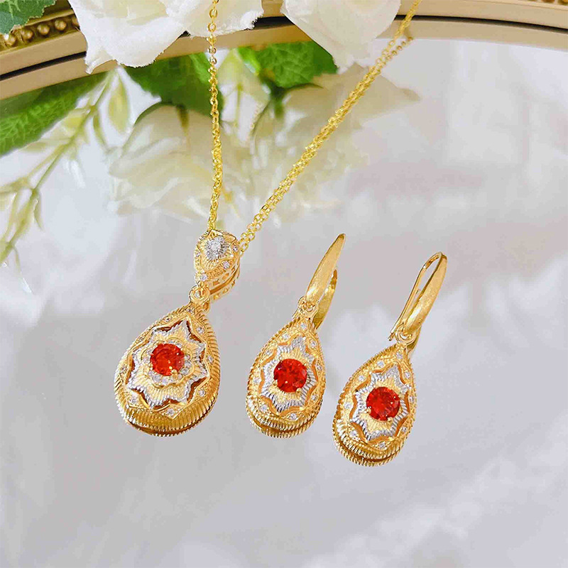 Live Selling Handmade Brushed Ruby Necklace Set Vintage Palace Style Red Diamond Hook Earring Pendant Women
