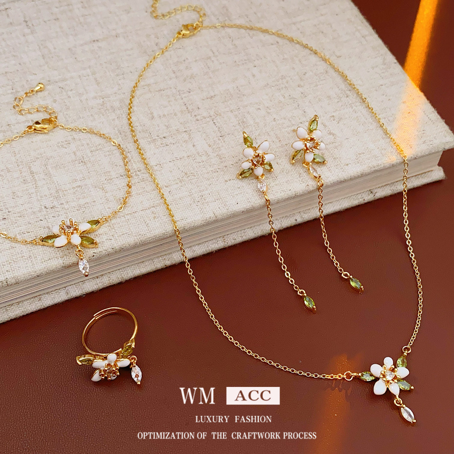 Real Gold Electroplated Oil Dropping Flower Enamel suit French Retro Light Luxury Bracelet Ring High-end Necklace Earrings Women