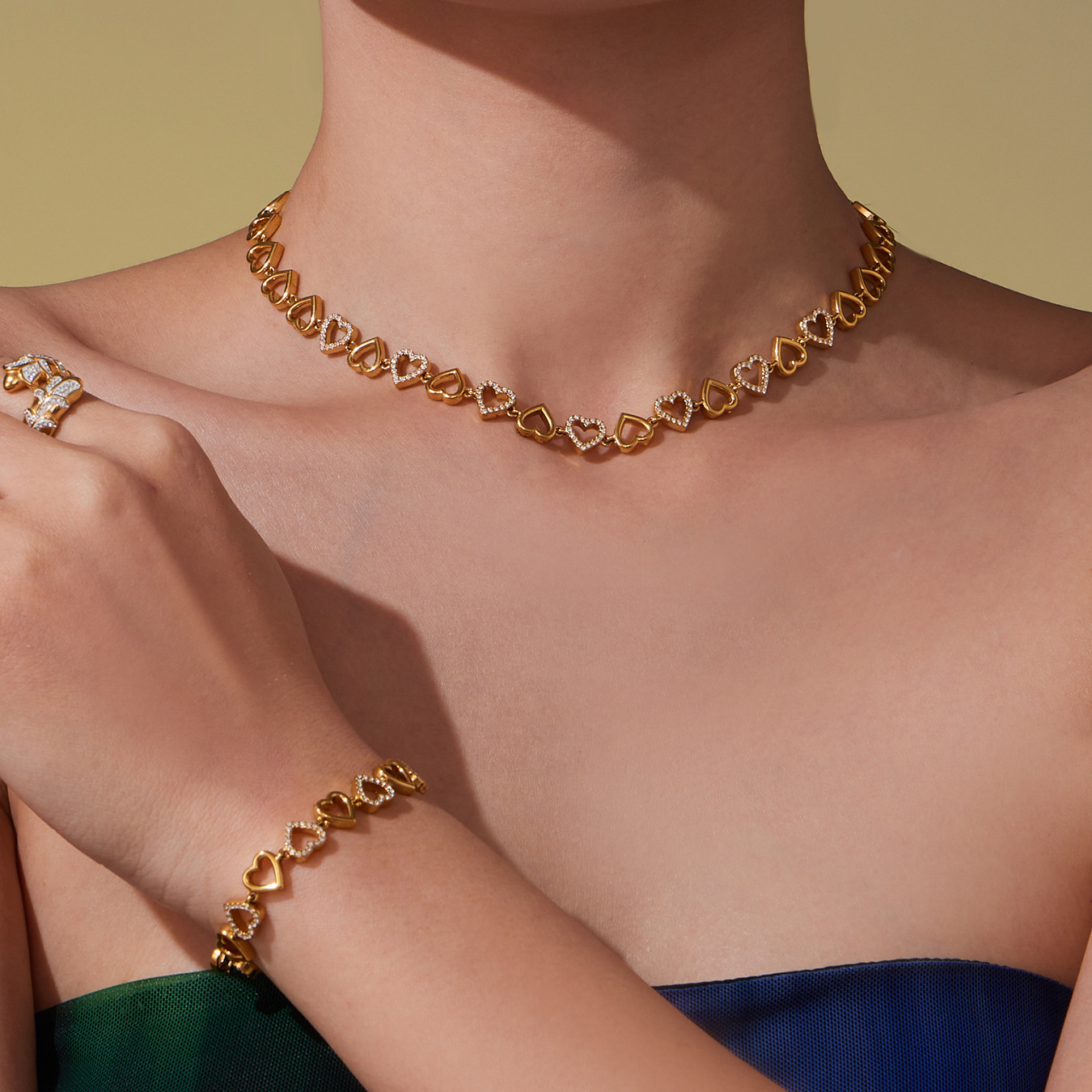 Xinyixinxin Cross-Border New Stainless Steel Full Diamond Heart Handmade Chain Necklace Bracelet Set Plated with 18K Real Gold Jewelry