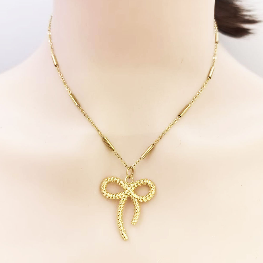 New French-Style Ins Fashion Temperament Bowknot Stud Earrings Necklace Set for Women, Niche High-End Titanium Steel 18K Gold