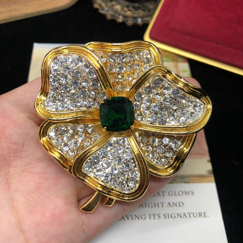 Emerald Gem Brooch Antique Full Diamond Design All-match Pin Copper Plated Real Gold Flower Corsage Earrings suit