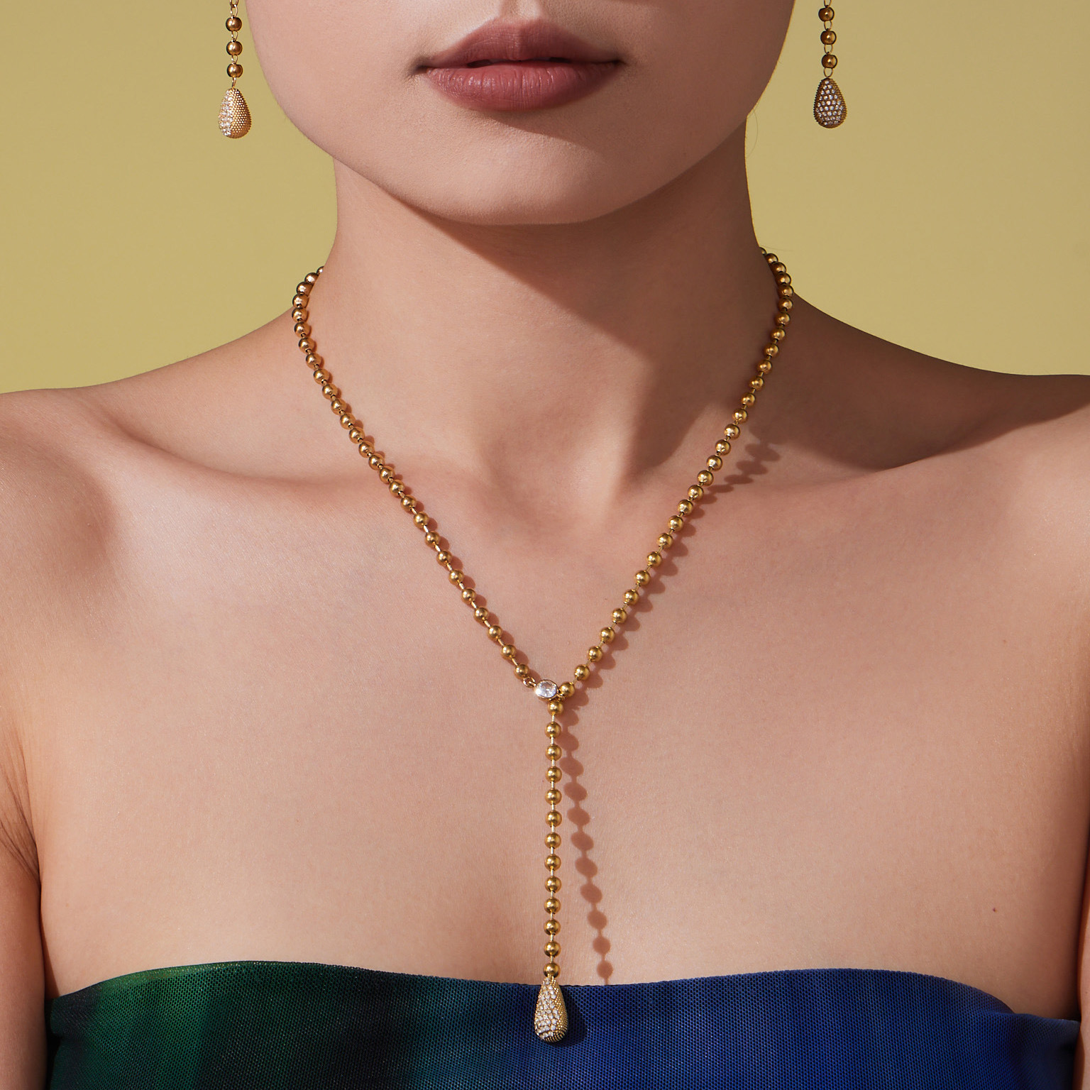 Miduoduo Cross-Border New Stainless Steel Rice Bead Chain Water Drop Zircon Pendant Necklace Earrings Set Plated with 18K Real Gold