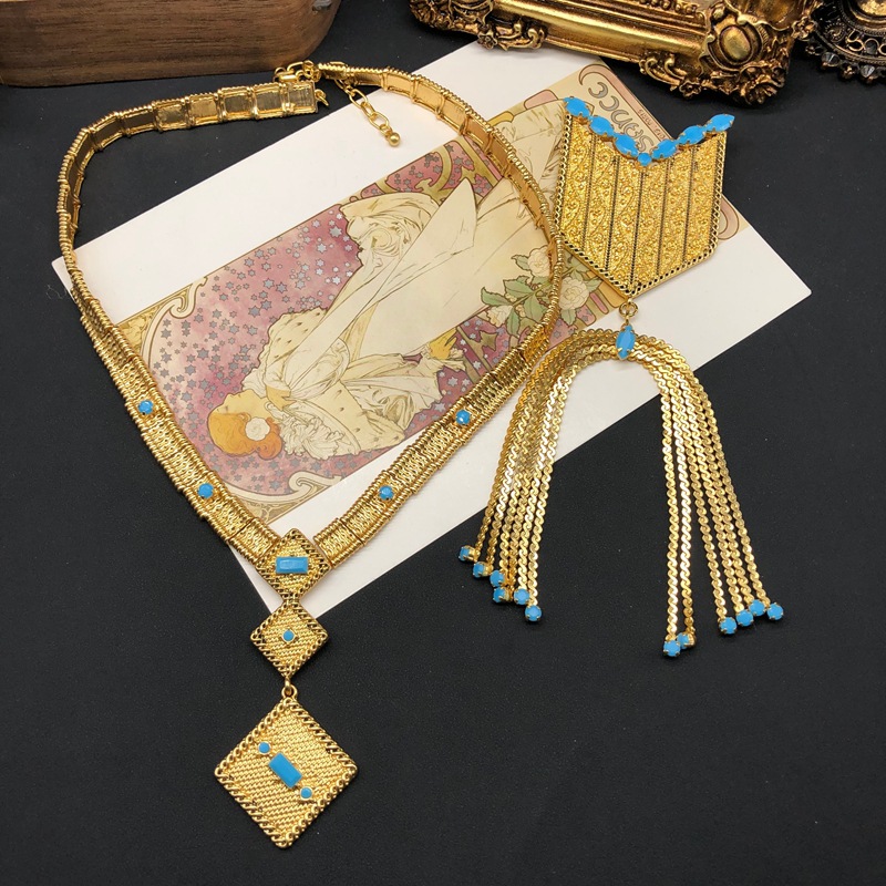 Bohemian Style Real Gold-Plated Geometric Design Necklace Brooch Set Decoration Blue Diamond Inlaid Vintage Versatile Jewelry