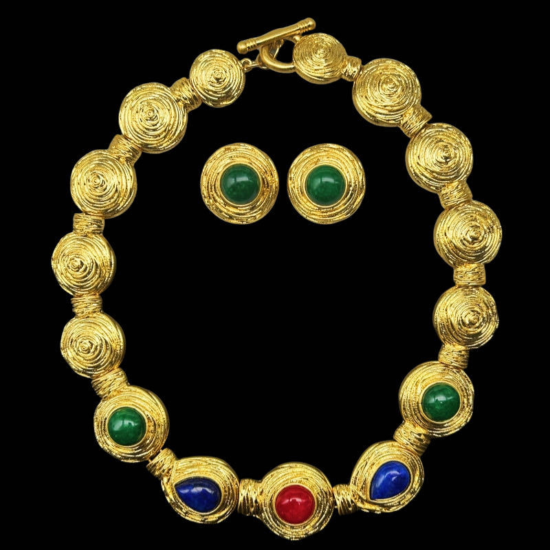 Middle Ancient Vintage Heavy Industry Electroplated Real Gold Three-dimensional Spiral Pattern Court Style Elegant All-match Necklace Earrings suit