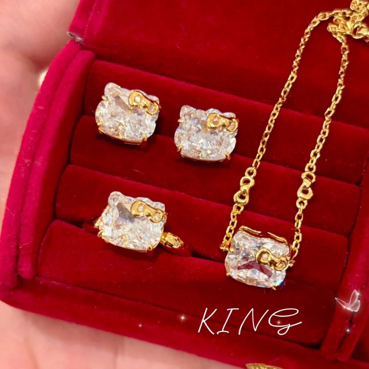 Hello Kitty Full Set of Jewelry·Gold-Plated Claw-Set White Diamond Kt Cat Cute Necklace Bracelet Ring Earrings Set