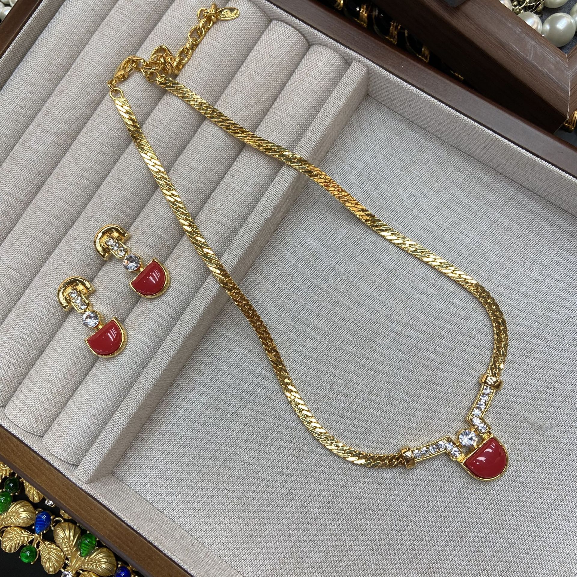 New Chinese Romantic Red Shoushan Stone Letter D Earrings Diamond Earrings Copper Chain Plated Gold Necklace suit