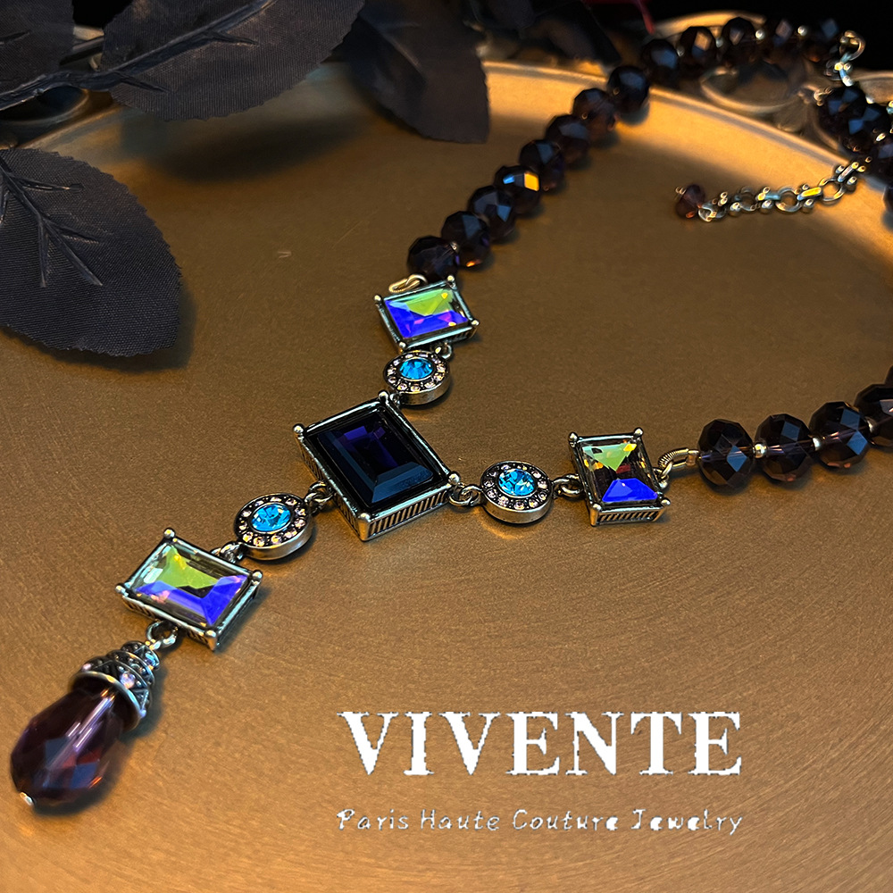 Middle Ancient French Romantic Blue Gem Diamond Silver Needle Earrings Necklace Set Copper Chain Electroplated Real Gold Neck Chain Earrings