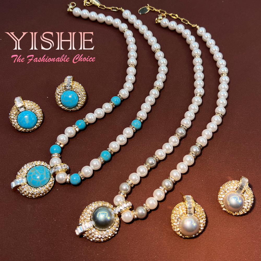 Maillard turquoise rhinestone suit copper plated gold advanced handmade pearl Mabei advanced necklace ear studs