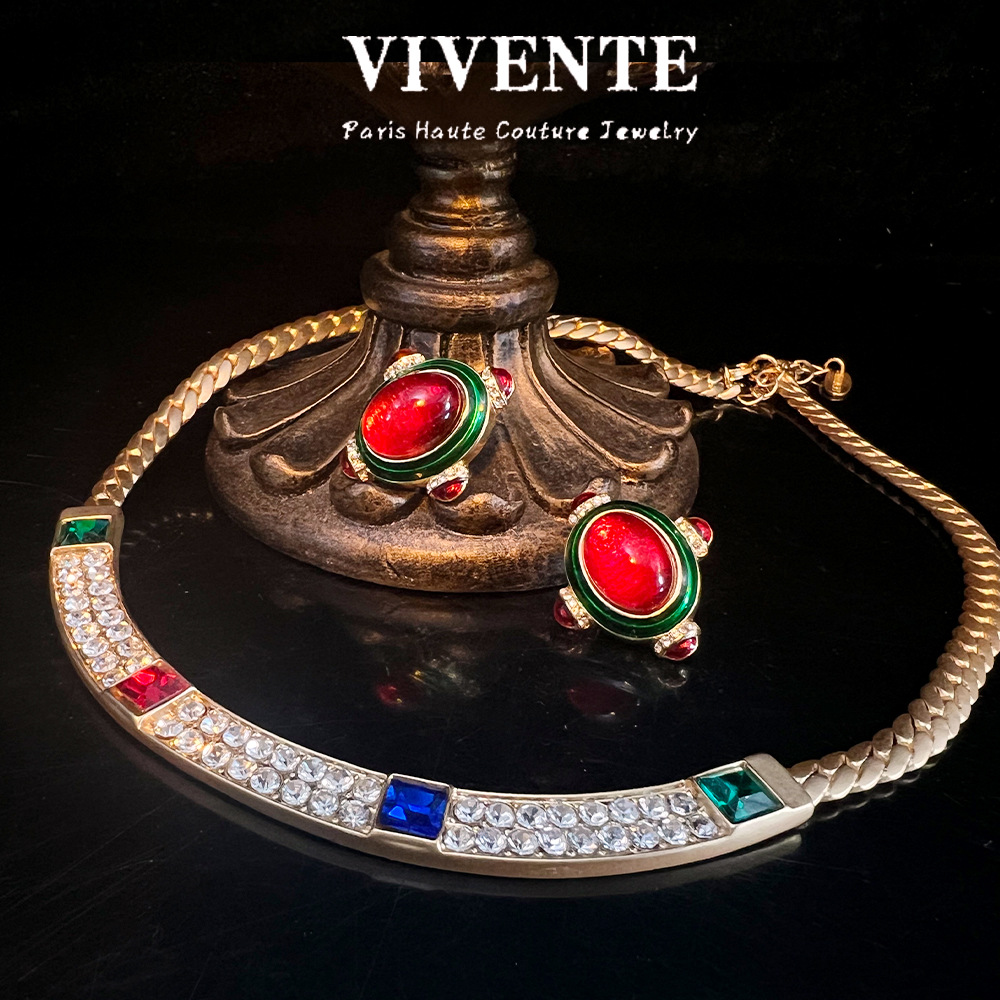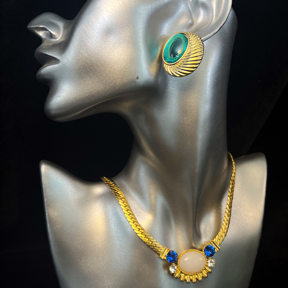 Middle Ages Emerald Glaze Necklace Earrings Plated with Real Gold and Jewel Diamond Neck Chain Earrings Ear Clip Set