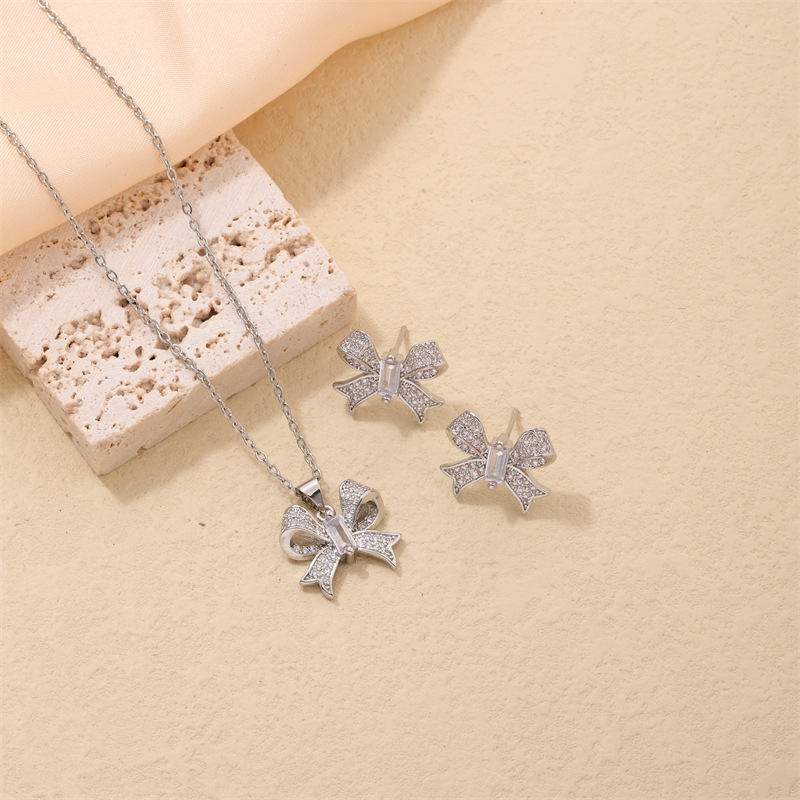 Cross-border bow earrings necklace two-piece European and American new copper plated real gold micro inlaid zirconium suit jewelry wholesale
