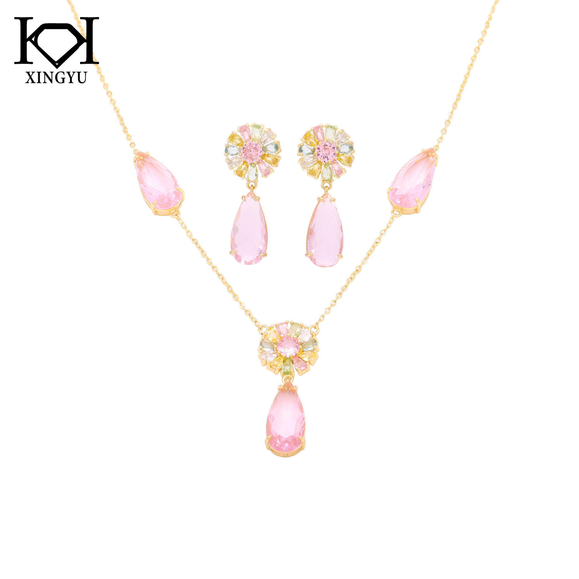 Powder drop-shaped color treasure petals zircon suit women's bright luxury earrings necklace copper plated 18k gold jewelry women