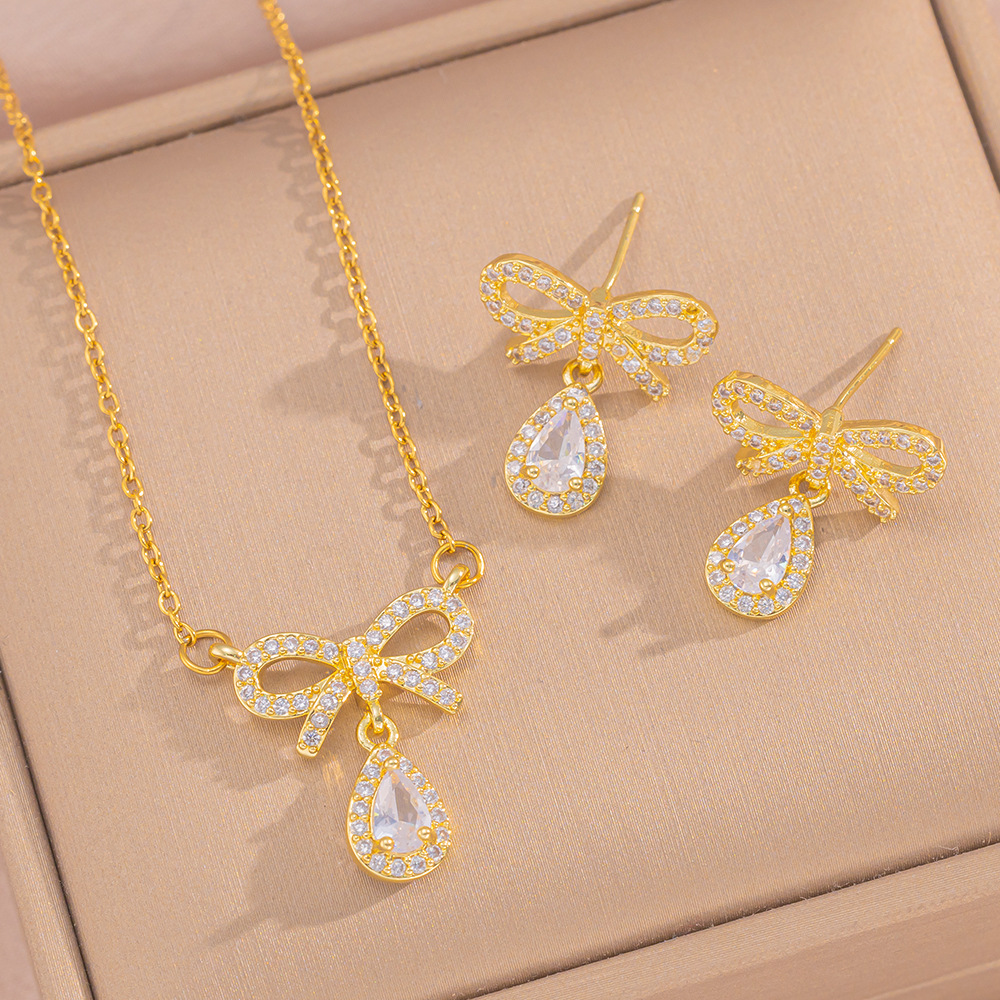 [Set] Sweet Bow Love Necklace Earring Set Zircon Necklace Women's Fresh and High-End Clavicle