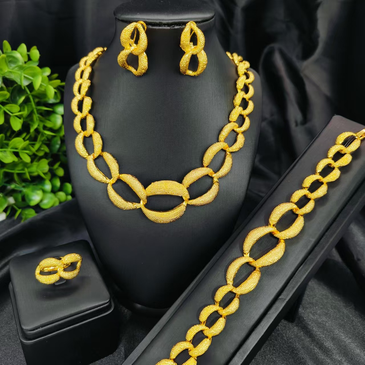 24k Gold Faux Gold Wedding Jewelry Set Dubai India Nigeria Bride Necklace Earrings Bracelet Ring