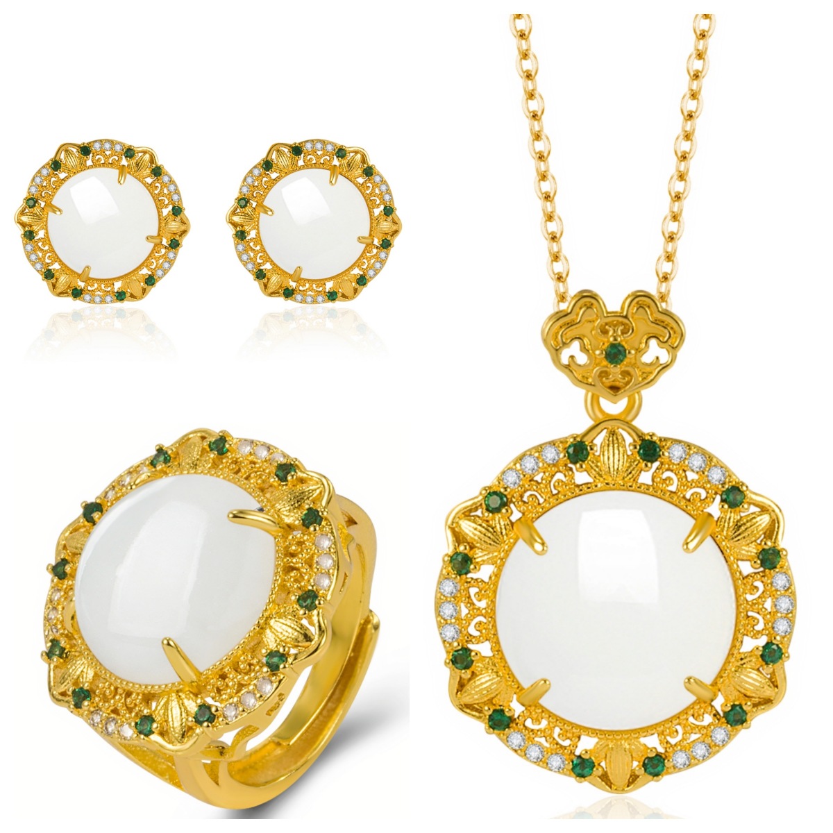 Palace Style Caibao Hotan White Jade Ring Earrings Pendant Necklace Jewelry Set Green Diamond Flower White Jade Jewelry