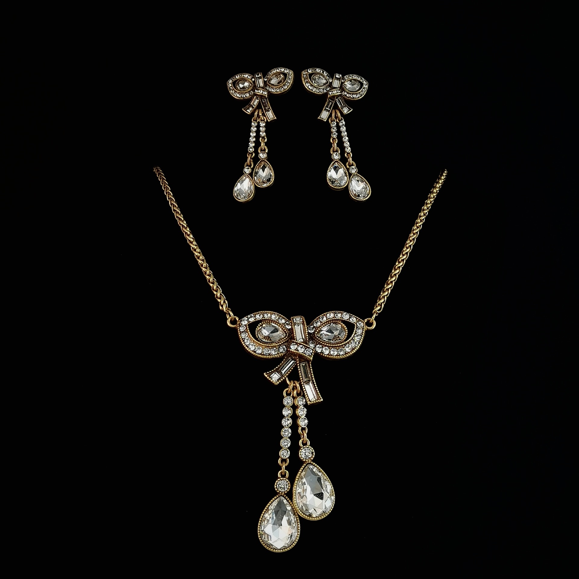 Medieval Style Vintage Full Zirconium Bow Earrings European and American Style Accessible Luxury Necklace Real Gold Plated Women's Jewelry Set