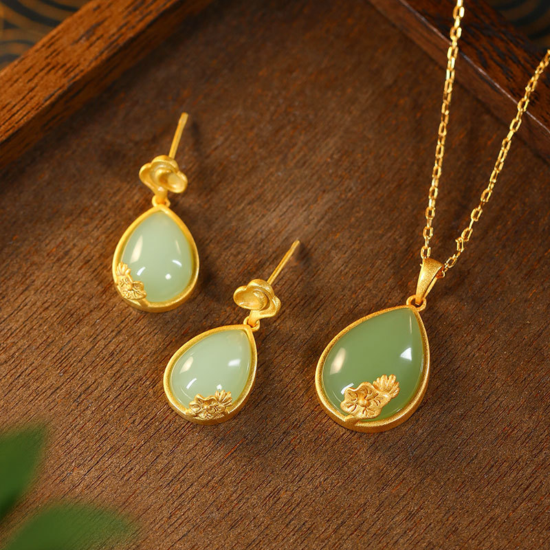 Real Gold Electroplated Silver Needle New Chinese Water Drops Imitation Jade Ear Hook Earrings National Style Elegant National Tide Necklace suit