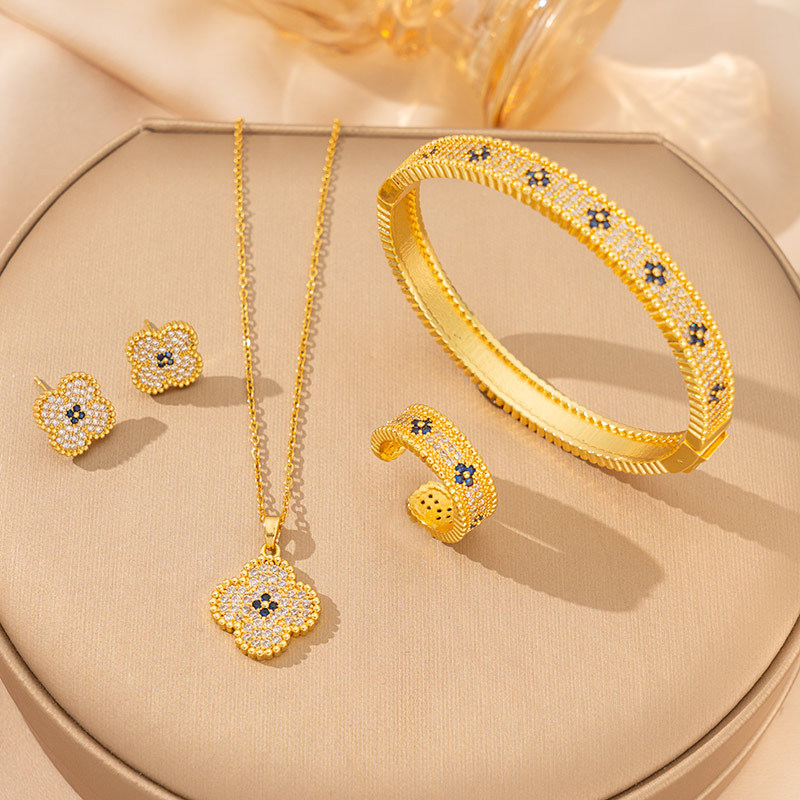Copper Inlaid Zirconium Titanium Steel Flower Four-Leaf Clover Necklace for Women, High-End Electroplated Light Luxury Earrings, Pendant, Ring Jewelry