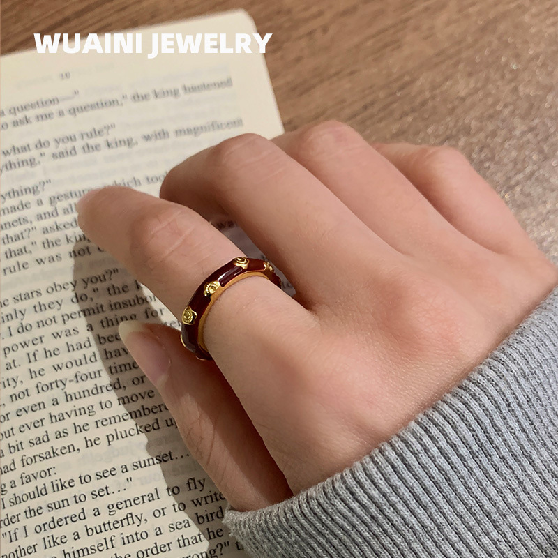 New Year gift red enamel plum blossom flower ring female niche cold wind ring ring titanium steel plated 18K gold