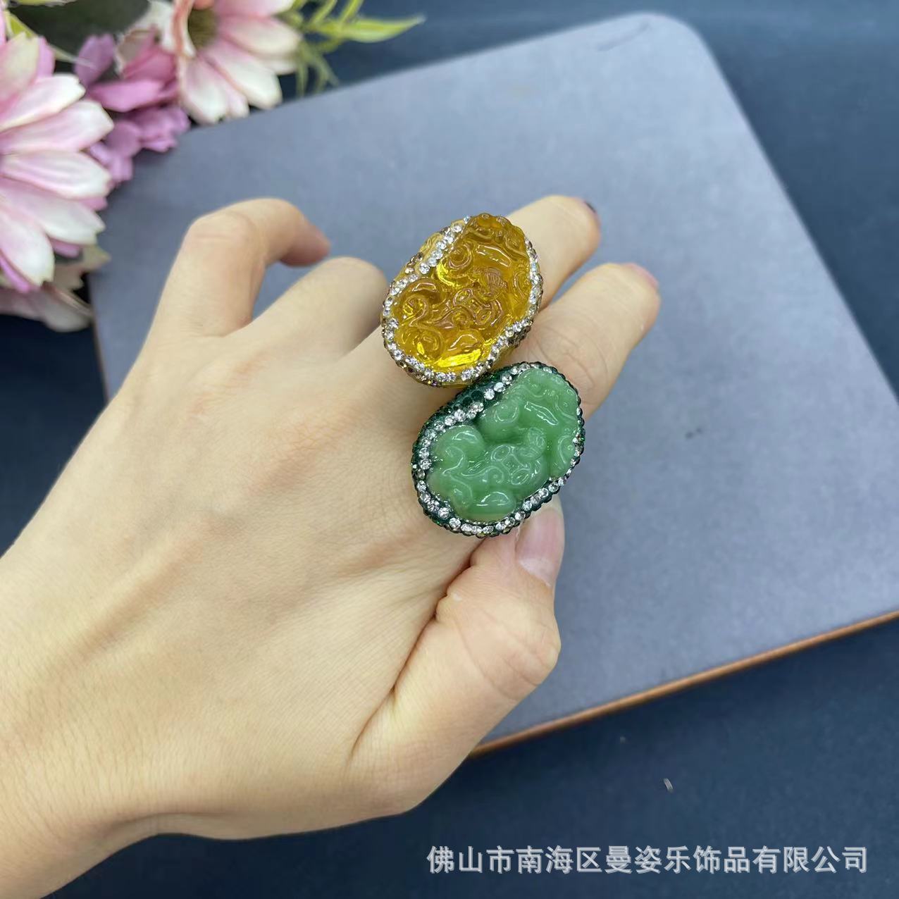 Colored Glaze jade ring European clay open ring 18K real gold color-preserving electroplating niche accessories New