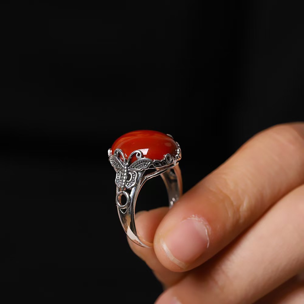 Thai Silver Retro Old Chinese Style Jewelry Inlaid with Southern Red Butterfly Ring Hand Jewelry Open Ring Index Finger Ring Wholesale