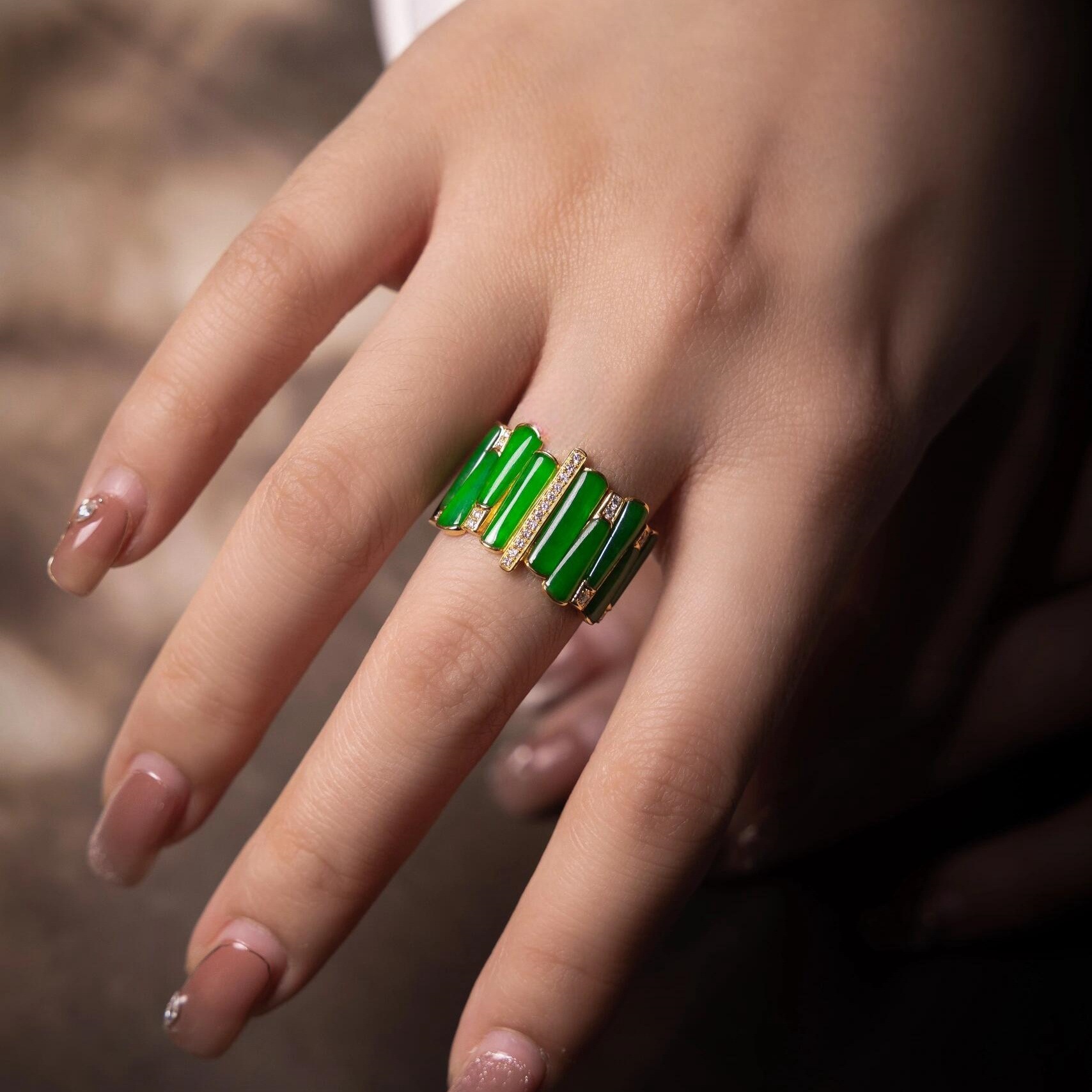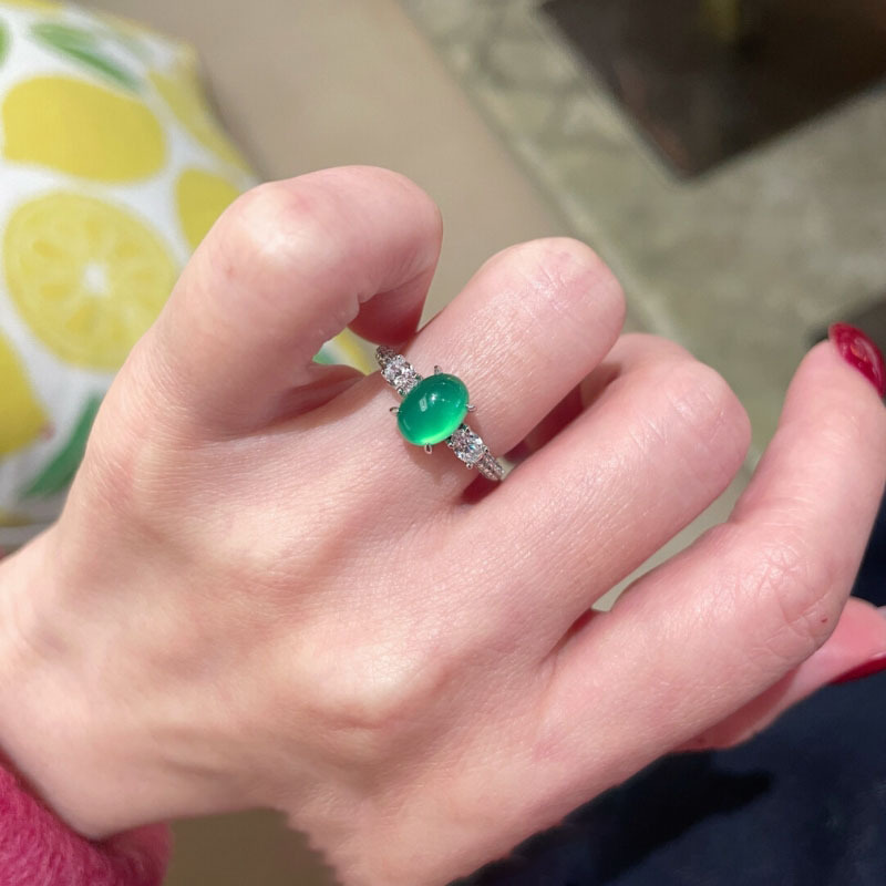 Vintage New Chinese Style National Trend Green Chalcedony Half-Circle Full Diamond Ring Elegant Light Luxury Everyday Versatile Women's Index Finger Ring