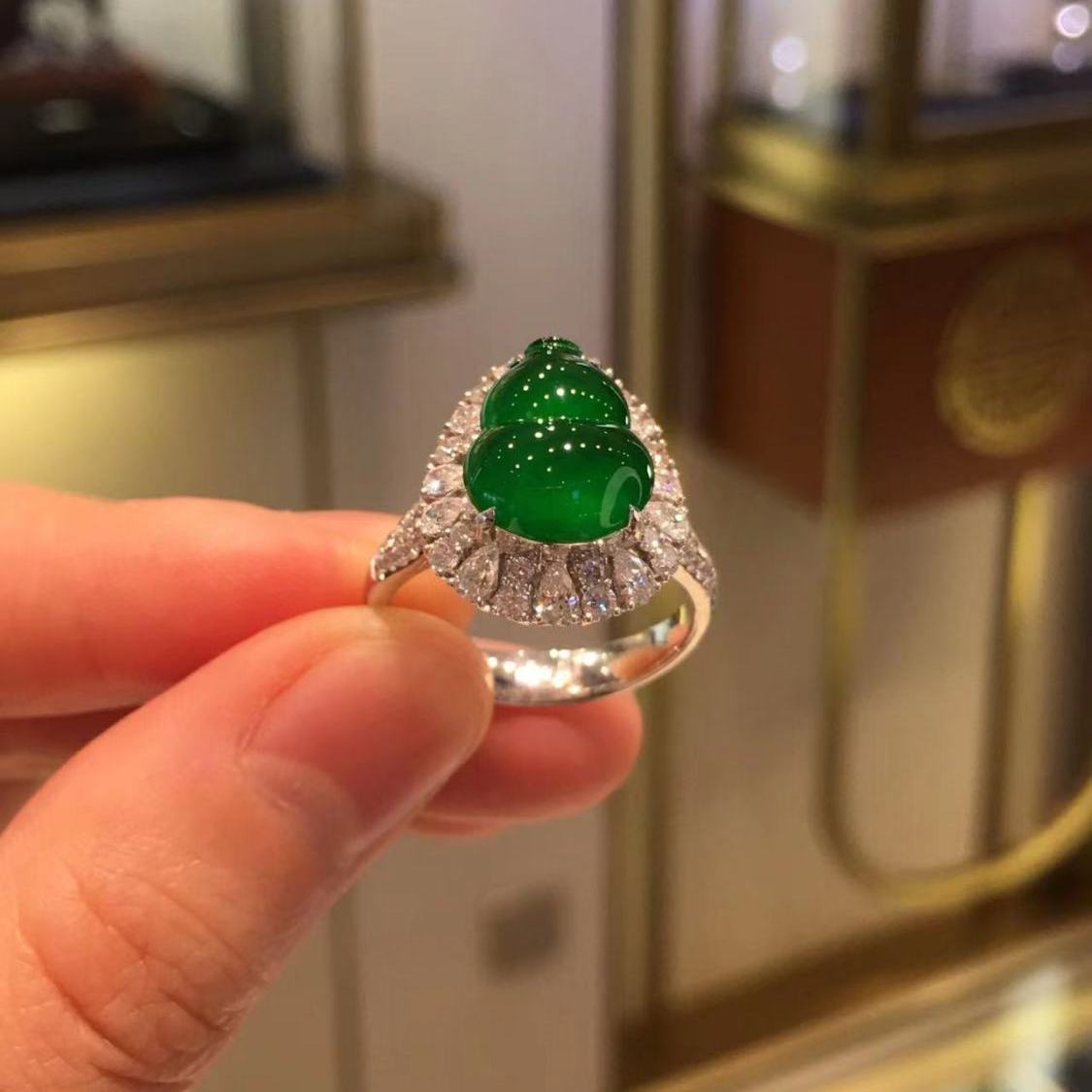 Imitation glass Emperor green gourd ring elegant fashion adjustable with Diamond ice wholesale niche design
