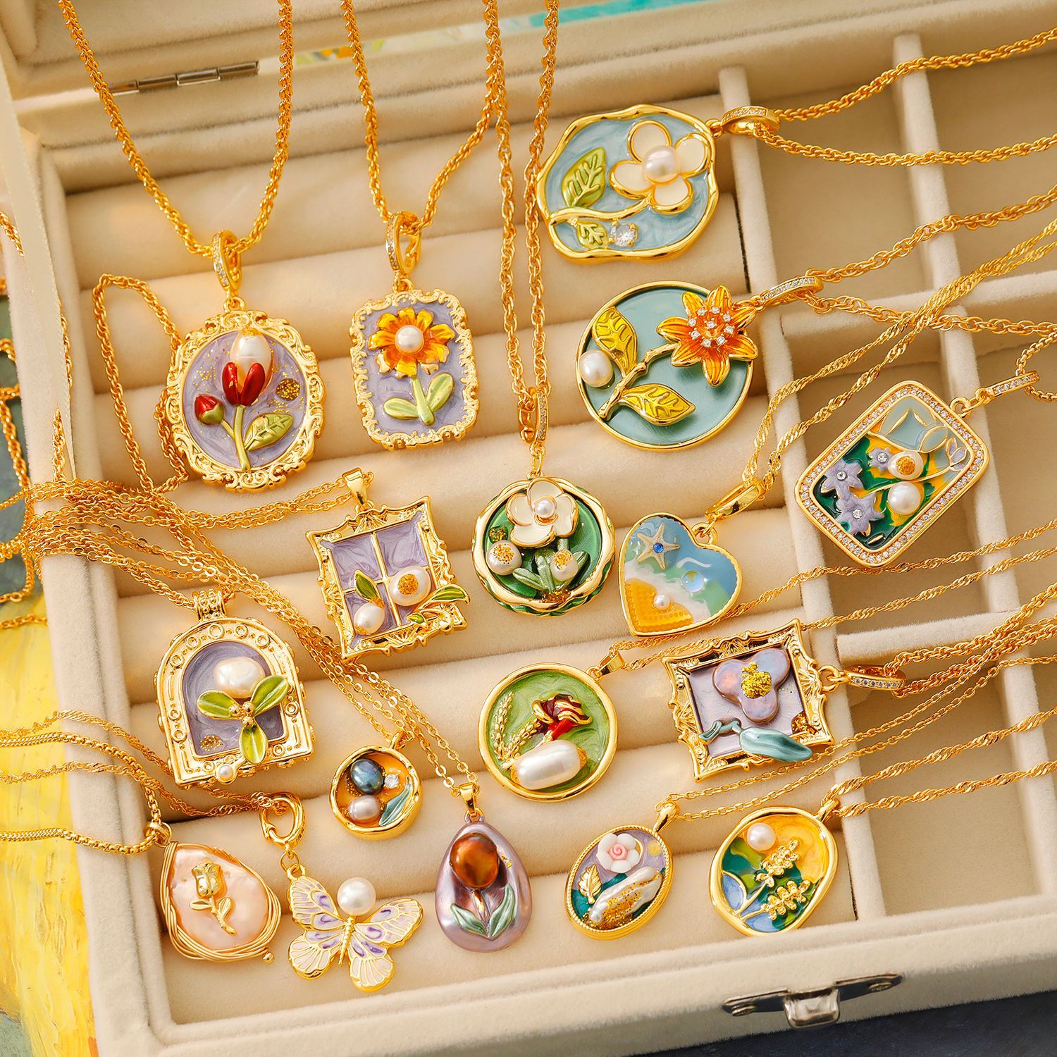 Monet Van Gogh Vintage Oil Painting Style High-End Necklace Baroque Pearl Butterfly Petals Sweater Chain Pendant