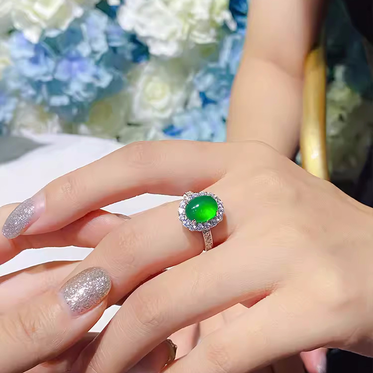 Natural Chalcedony Ring for Women Sun Green Cabochon Plated 925 Sterling Silver Ring Green Agate Comparable to Jade Adjustable Jewelry