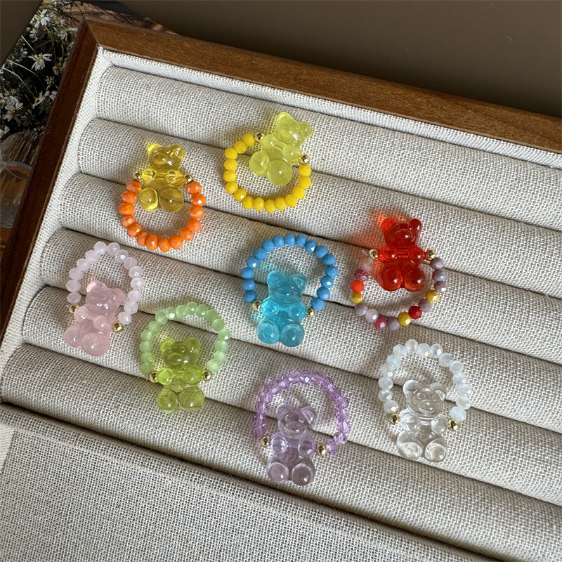 Korean Style New Ins Style Crystal Beaded Candy Transparent Color Bear Ring Dopamine Sweet All-Match Ring
