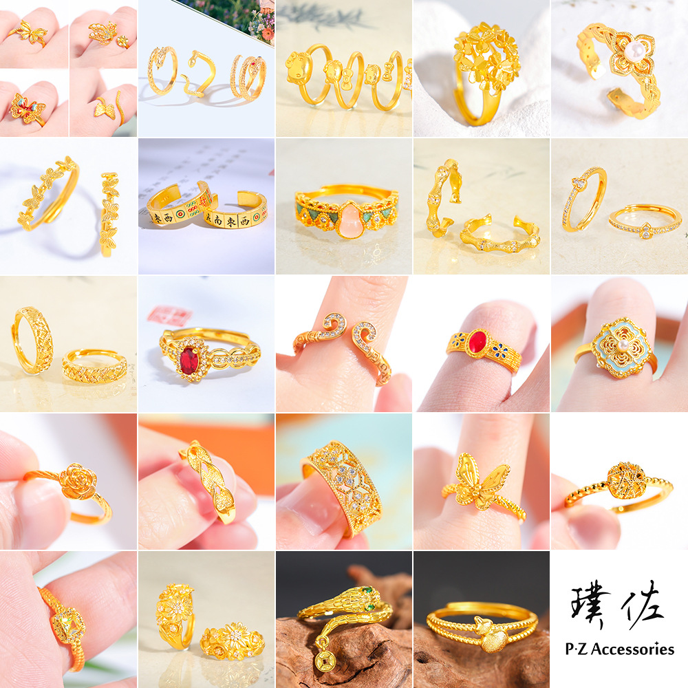 Collection of Traditional Gold Open Ring Designs from Puzuo Gold Store, Including Filigree Ruyi Coin Index Finger Rings
