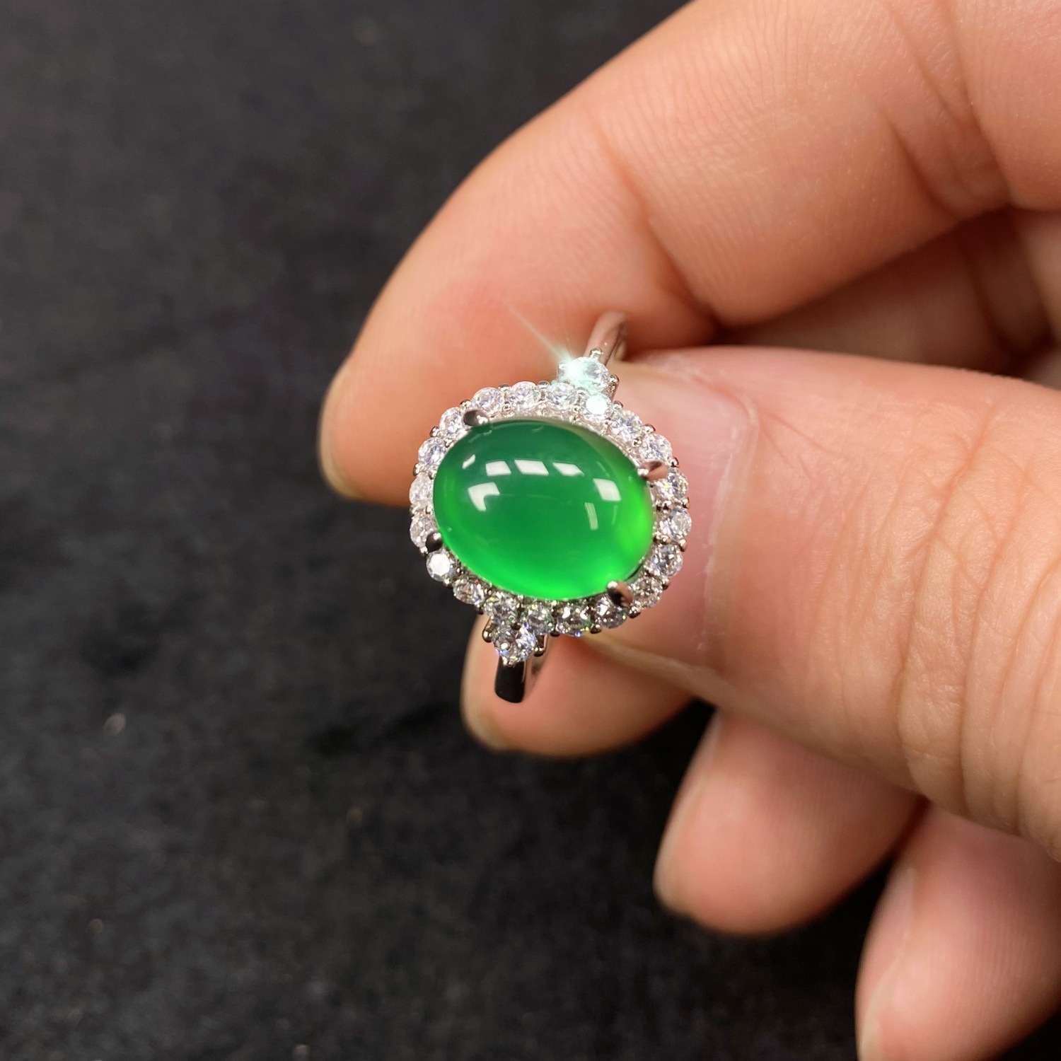 Natural Chalcedony Ring Female Imperial Green Egg-Faced Agate Full Diamond Ring Adjustable Ring Jewelry