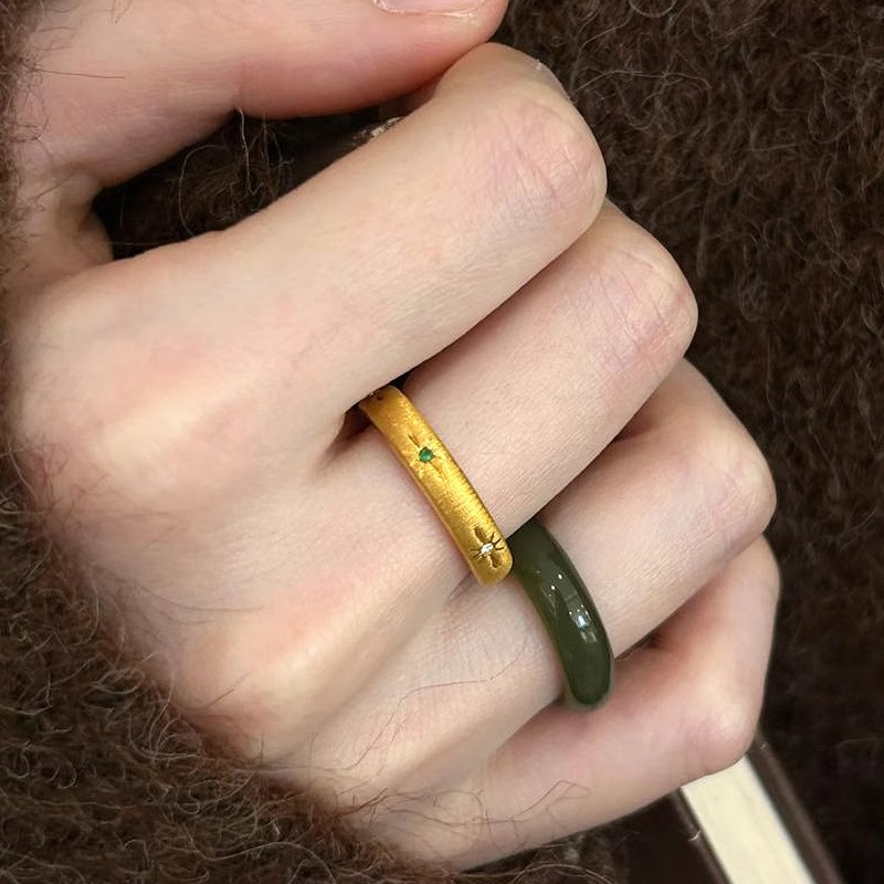 Xiaohongshu's Popular Brushed Six-Pointed Star Ring, Old-Fashioned Money-Style Green Diamond Eight-Pointed Star Stacking Ring