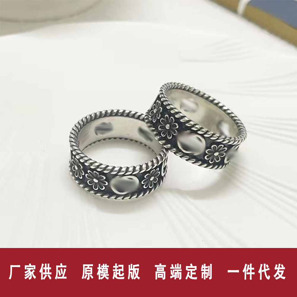 Vintage Daisy Ring with Double G, White Copper High Edition, Retro Dyed Black Aged Craft, Unisex Couple Ring, Non-Fading
