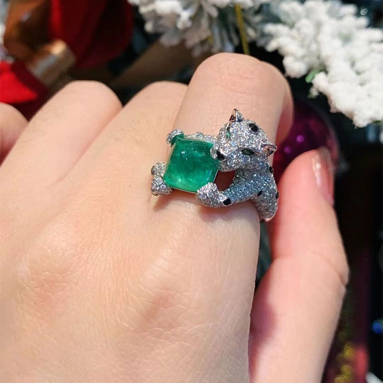 Caibao French Luxury Leopard Emerald Ring Women's Opening Adjustable Index Finger Ring Elegant Cold Style Internet Celebrity