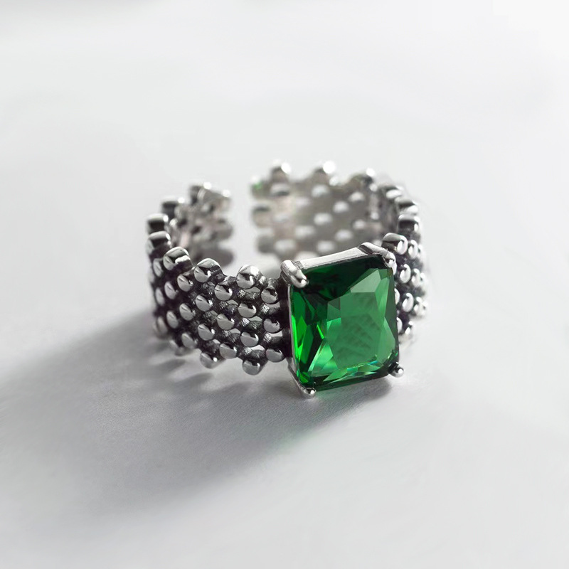 Wide Face Green Zircon Ring Opening Design Retro Silver Plated Old Craft Food Ring Niche Personalized Hand Jewelry