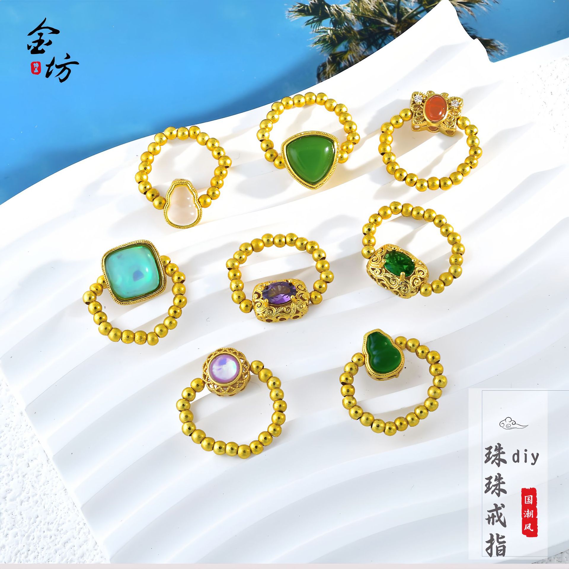 Chinese Style Ancient Gold DIY Accessories with Diamond Beads, Bead Rings, Elastic Cord Rings, Chinese Style Jewelry