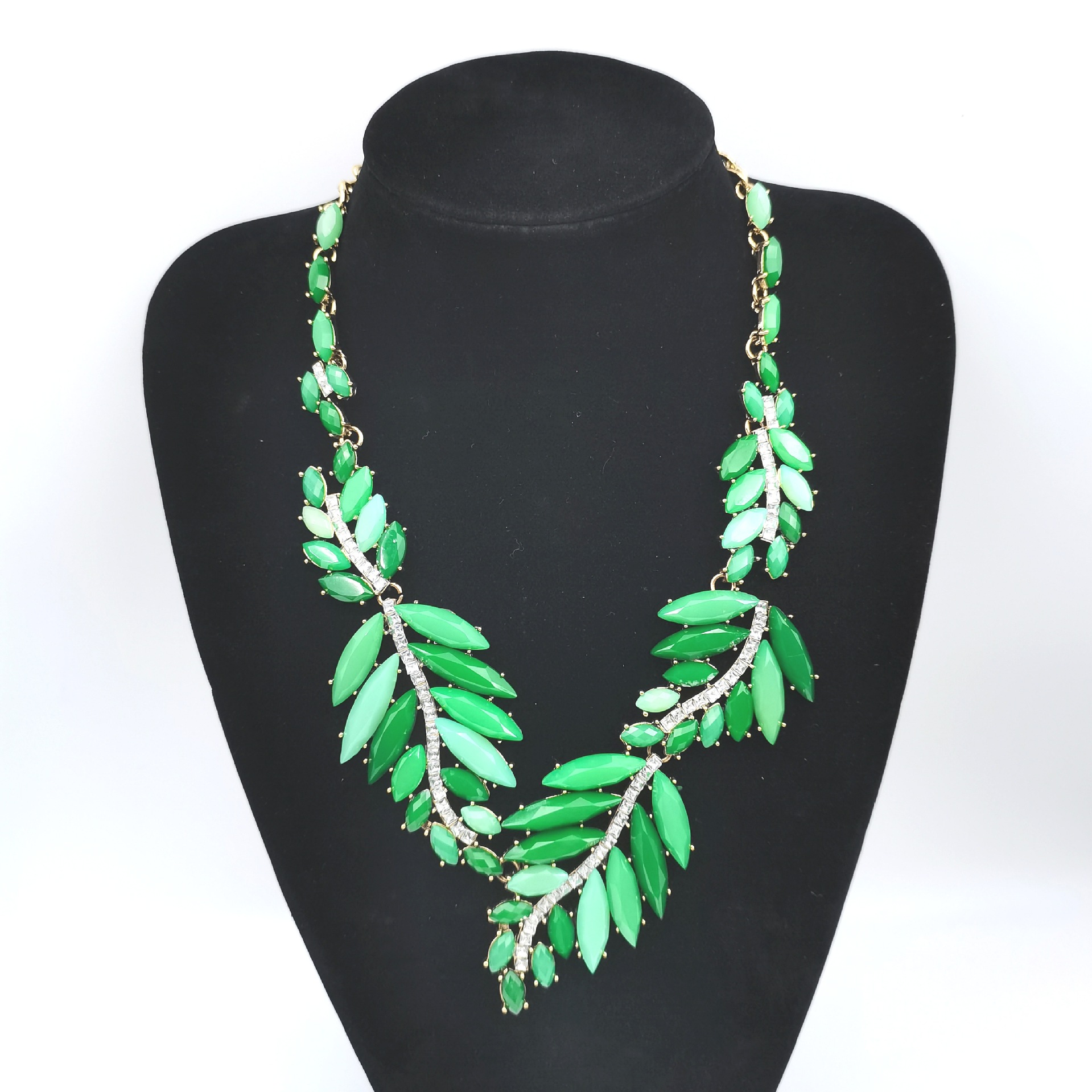 European and American fashion cross-border simple green leaf necklace resin Diamond-embedded personality temperament clavicle chain wholesale