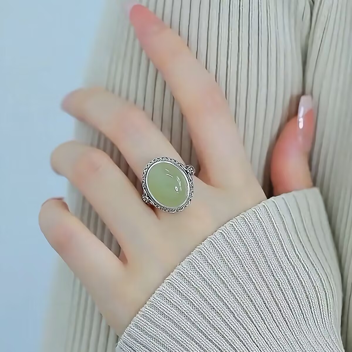 Silver Retro Chinese Style Imitation Hetian Jade Green Cut Out Egg Ring for Women New Chinoiserie Ethnic Style Niche Design Ring